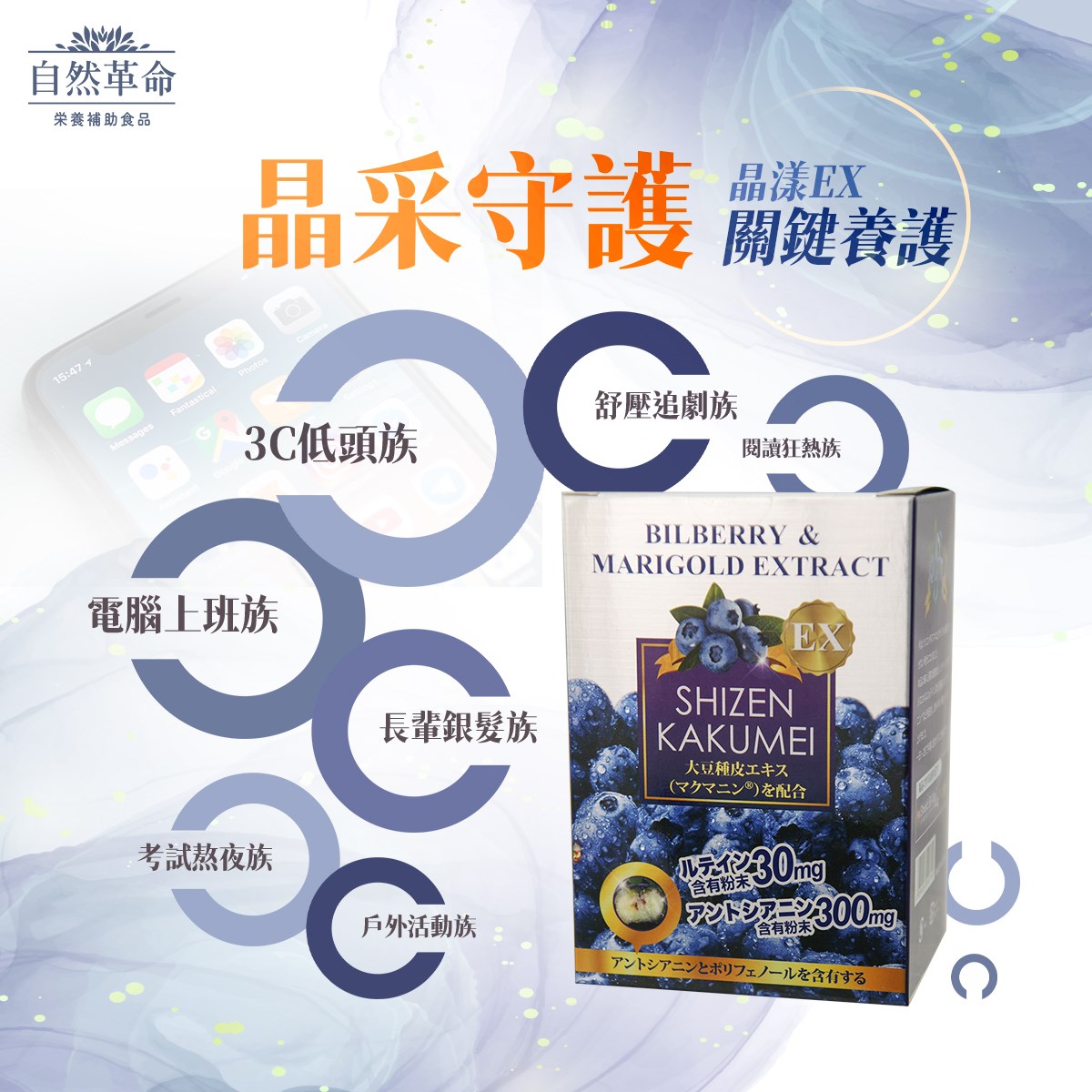 現代人長時間使用手機、電腦,容易造成專注力下降、感受模糊、疲勞不適等問題。💻 你知道嗎?補充「葉黃素」、「花青素」等營養素,有助於維持感官靈敏度,讓世界看得更清晰!🌟 自然革命-晶漾 EX,結合多種國際專利成分,完整守護靈敏感受,不僅提升視覺靈活度,更幫助舒緩不適感,讓你保持專注感受,看得更清晰!